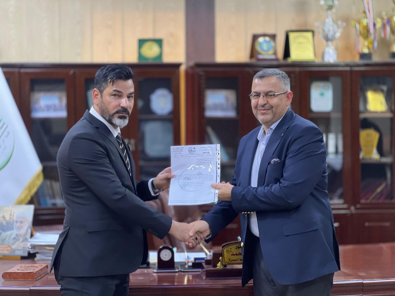 On the sidelines of the field visit by the two ministerial evaluation teams tasked with assessing the Bachelor's degree programs in the Department of Soil Science and Water Resources and the Department of Agricultural Machinery and Equipment, the Dean of the College of Agriculture at the University of Basra honored the ministerial committees by presenting them with letters of appreciation, in recognition of their scientific and professional efforts within the framework of program accreditation procedures.